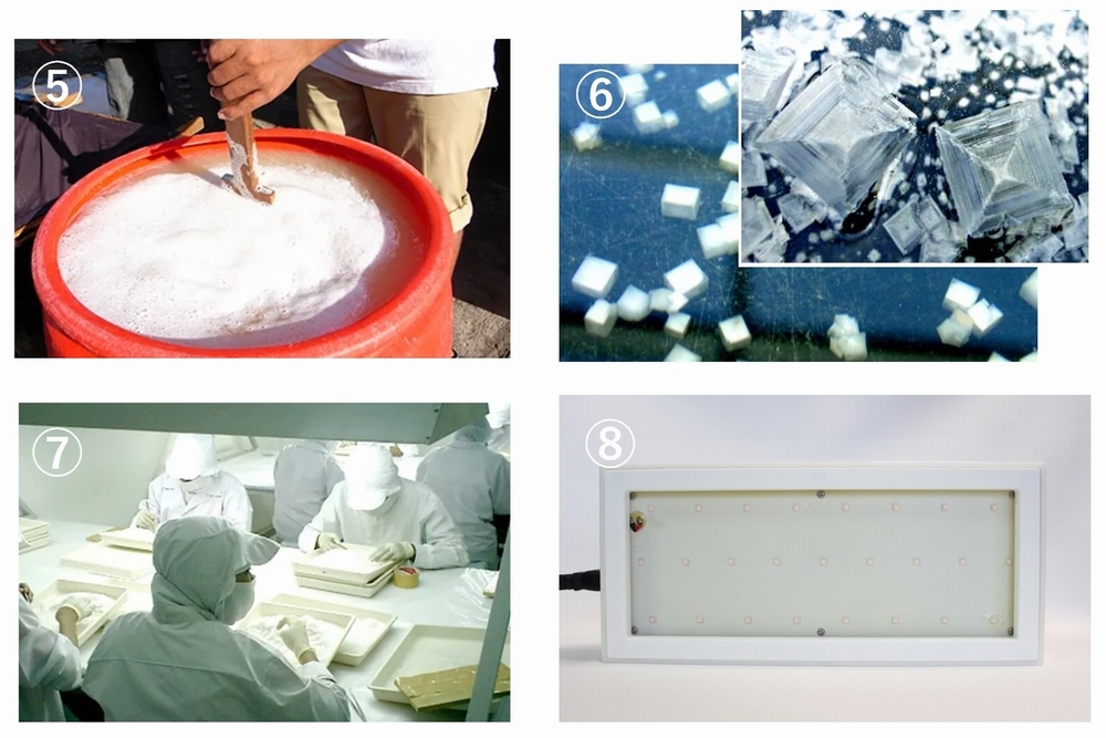 日本国内にてテラヘルツ帯域の光を照射して熟成させ、塩のエネルギーを高めます。その後、最終工程の品質チェックを行い、パッケージして出来上がります。 |