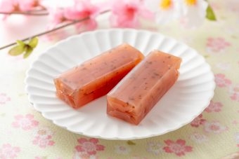 ミョウバン不使用の国産塩漬け桜葉を練りこみ、北海道産の白いんげん豆と甜菜糖で作った食べきりサイズのさくら羊羹です。